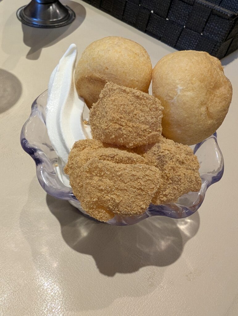 デザートは、ソフトクリームにブチシューと、きな粉わらびもちをのせて。