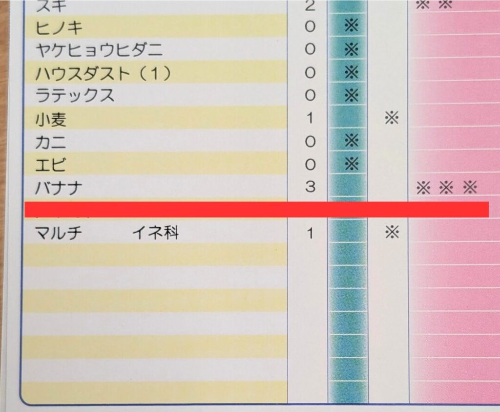 病院で検査したところ、なんと「バナナアレルギー」と判明💦しかもクラス3。実際の検査結果👇
