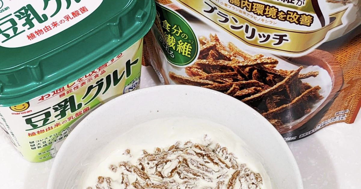 豆乳グルト120gとオールブラン40gを混ぜて一晩寝かせると、翌朝には、レアチーズケーキのような濃厚しっとり食感に😍美味しい😊
