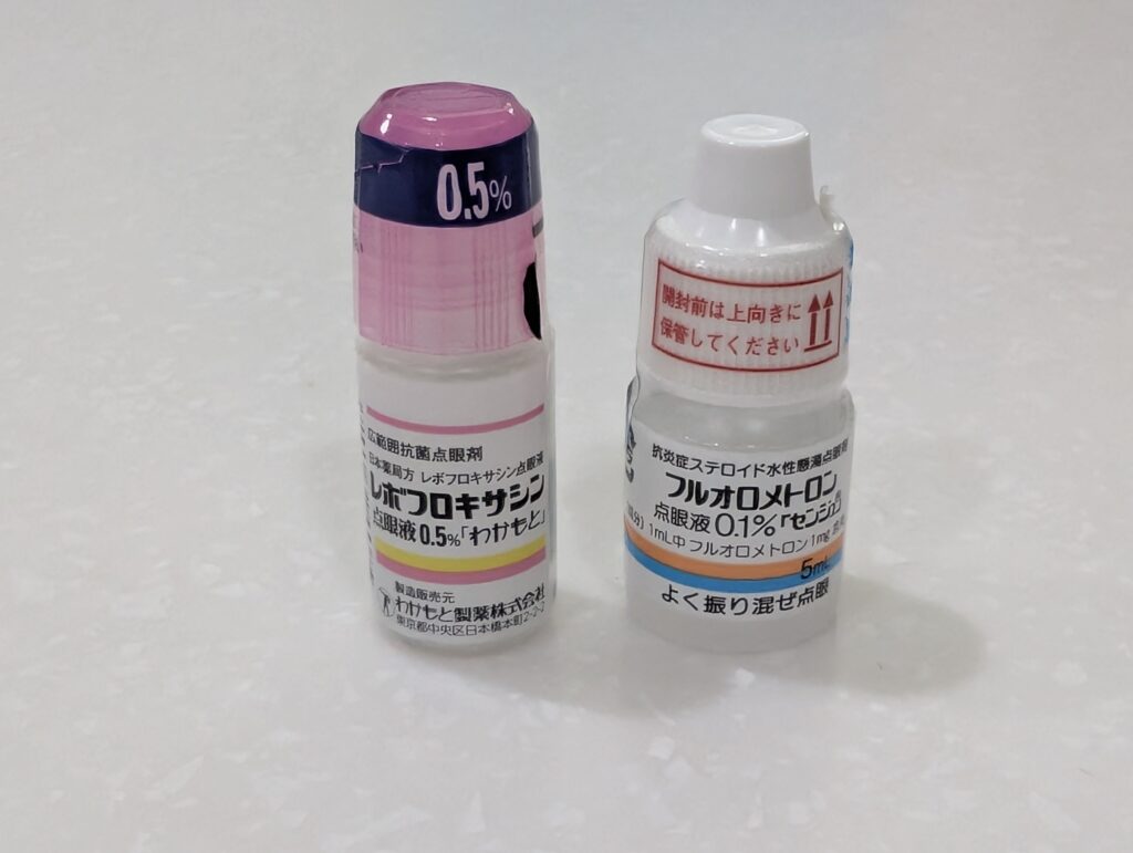 ●レボフロキサシン点眼液0.5%わかもと(画像左 ピンクのキャップ)